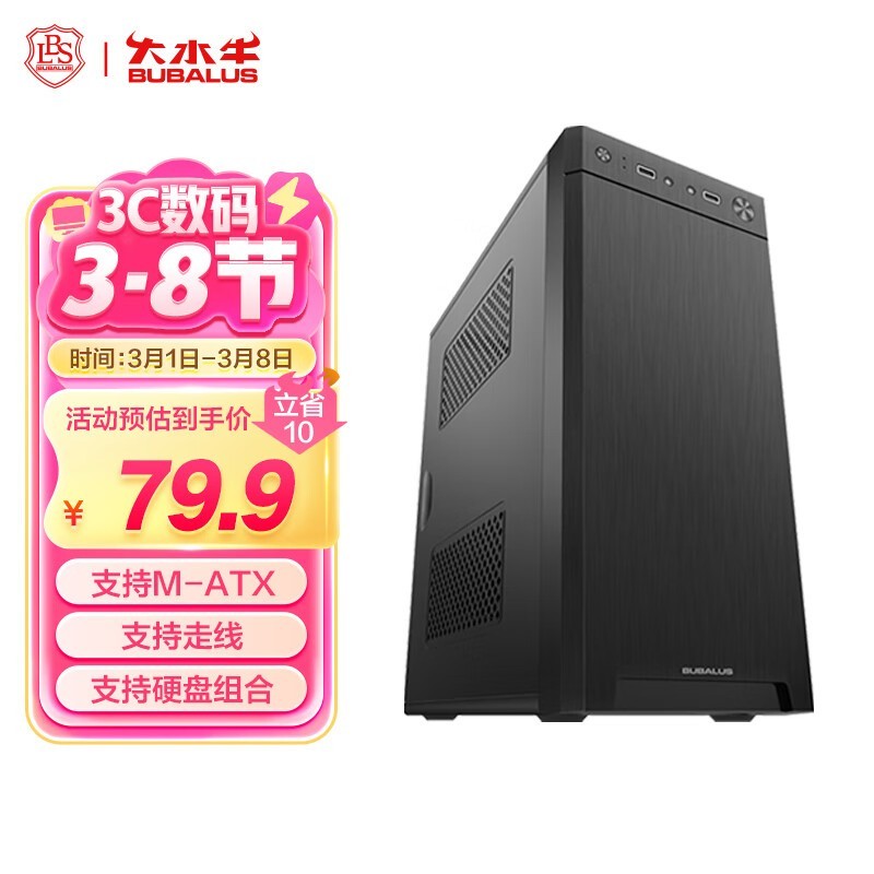 大水牛 商智U2 M-ATX机箱,专为预算有限但追求实用性的用户设计,特别适合办公场景使用。大水牛 商智U2机箱外观简约大方,价格实惠,散热效果优异且内部空间充足,能够满足日常使用的基本需求。大水牛 商智U2支持MATX和ITX主板,兼容125mm高的CPU散热器和260mm长的显卡,配备标准ATX电源位,提供3.5英寸硬盘位(兼容2.5英寸硬盘)。大水牛 商智U2前置支持120mm2风扇,后置80mm1风扇,侧板采用网孔设计,进一步提升散热性能。目前京东平台售价仅79.9元,原价89.9元,优惠到手价更划算,是办公装机的理想选择!
