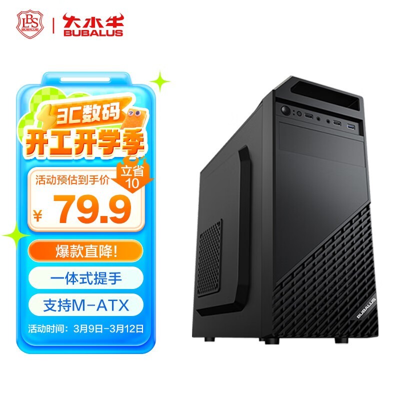 大水牛 风格商务办公台式电脑主机机箱,现正火热促销中!原价89.9元,现在京东平台仅需79.9元即可带回家!大水牛 风格机箱采用高品质SPCC板材与ABS塑料打造,简约时尚的设计风格,上部配备一体式提手,可承重20KG,方便搬运。大水牛 风格兼容M-ATX/ITX主板,支持CPU散热器限高145mm和显卡限长300mm,满足多种硬件需求。