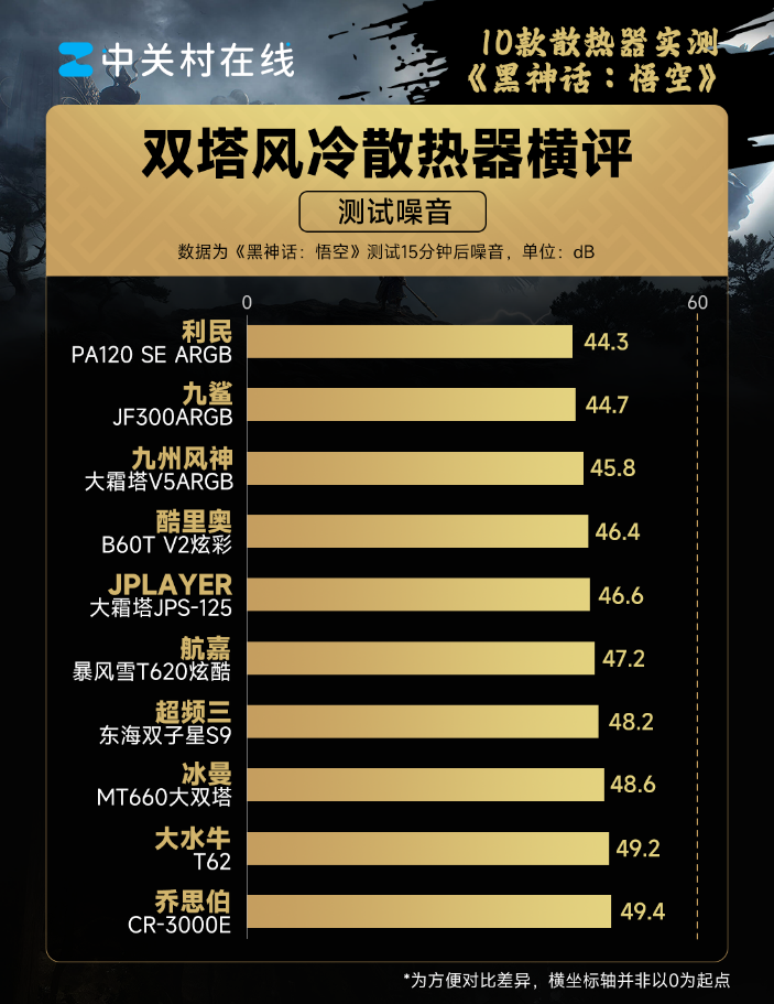 从测试结果来看,所有散热器的噪音都超过了40分贝,其中九鲨JF300ARGB,利民PA120SE ARGB和九州风神大霜塔V5ARGB的噪音控制在50分贝以内,整体的噪音表现优秀,而超过50分贝的散热器噪音就比较大,实际使用中即使有机箱阻隔也会有明显的噪音。