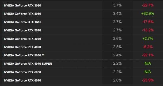 具体排名显示,RTX 3060以3.7%的市场份额位列榜首。自2021年发布以来,这款显卡一直保持着极高的市场地位,在Steam平台的显卡使用率排行榜中长期占据首位,占比超过5%。RTX 3060凭借其出色的性能表现,特别受到1080P游戏玩家和内容创作者的青睐。尽管存在矿卡风险以及性能上限的限制,但其整体表现仍然优于同价位的竞争对手,因此成为当前二手市场上备受追捧的选择。