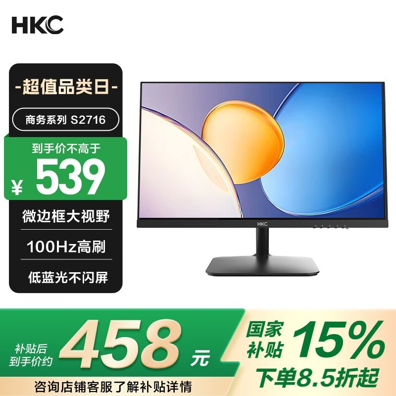 HKC S2716 27英寸IPS显示器(1920×1080、100Hz)正在京东促销。HKC S2716显示器原价539元,plus会员参与政府补贴立减15%优惠活动,下单1件,实付低至455.86元。