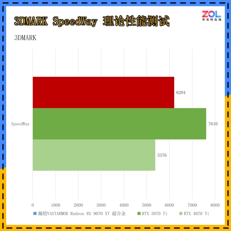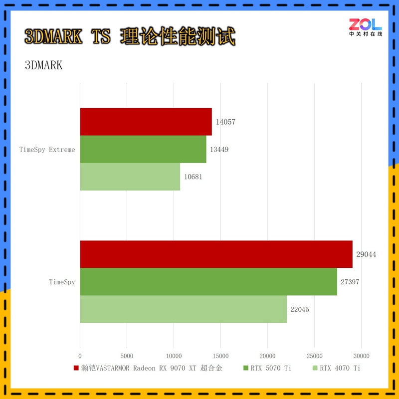 在针对显卡DX11性能的3DMARK FS套装测试中,瀚铠VASTARMOR Radeon RX 9070 XT超合金显卡相比RTX 5070 Ti性能略胜一筹。