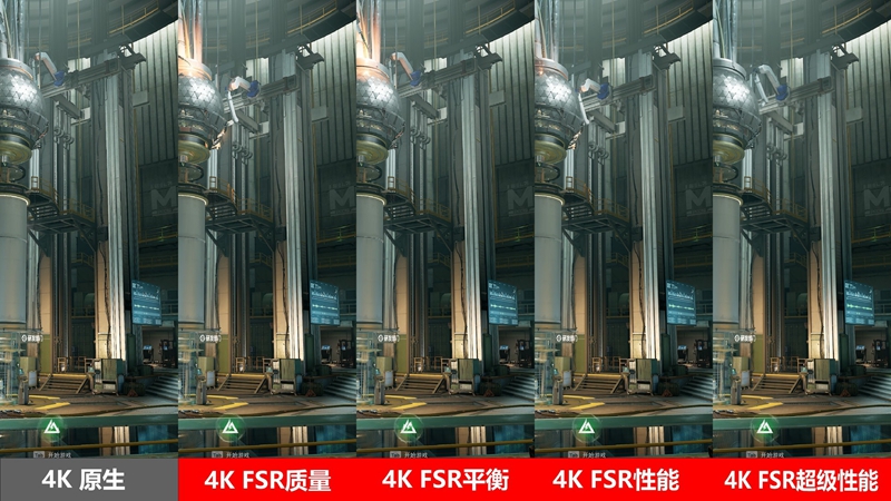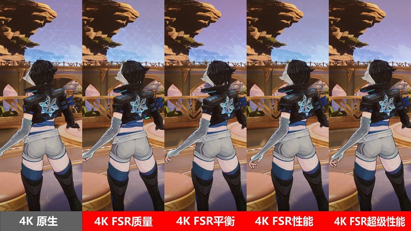 此外,游戏里的FSR会提供多种模式,以下是不同模式下画面质量的对比。总体来说4K原生画质更加细腻,而随着FSR档位从质量到超级性能,画面细节会略有差异,如果仔细观察的话会看出一些贴图细节和光影方面的差异,而在实际游戏过程中其实对于画面差异的感受不会那么明显。