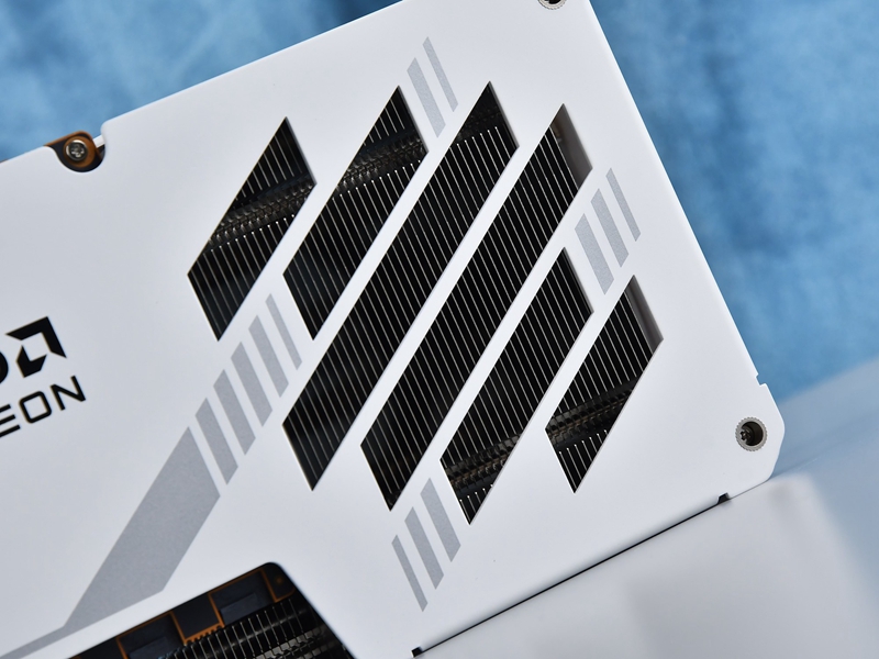其背板表面设计元素展现了设计感与实用性。左侧的六个平行四边形点阵以及右侧长短不等的斜向镂空设计都很有几何的美感,同时又增强了卡体的通透度,可以提高散热效率。背板左下角印有VASTARMOR的品牌logo,中间印有AMD Radeon字样,整个显卡设计非常漂亮,对于追求高颜值的用户而言是相当不错的选择。