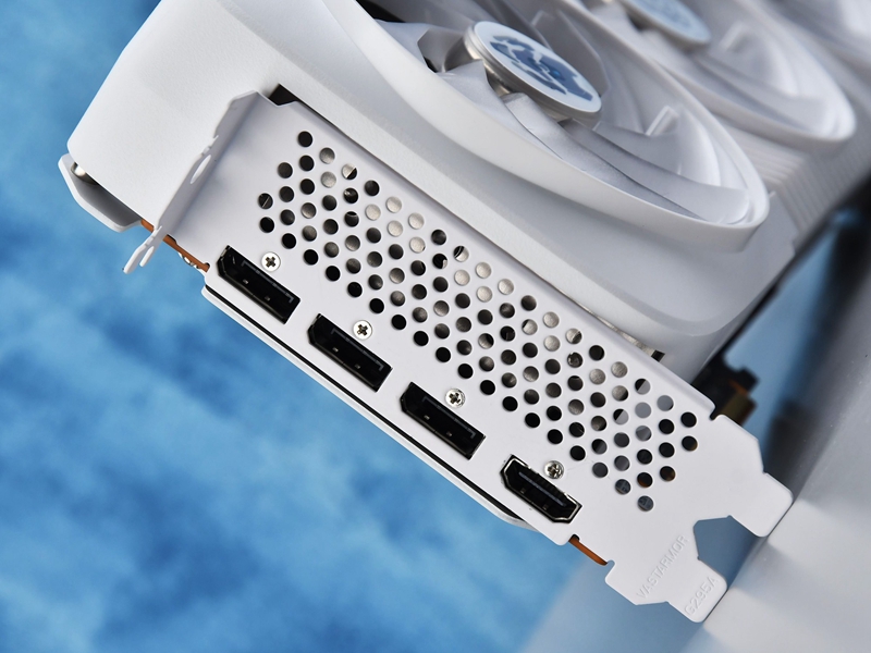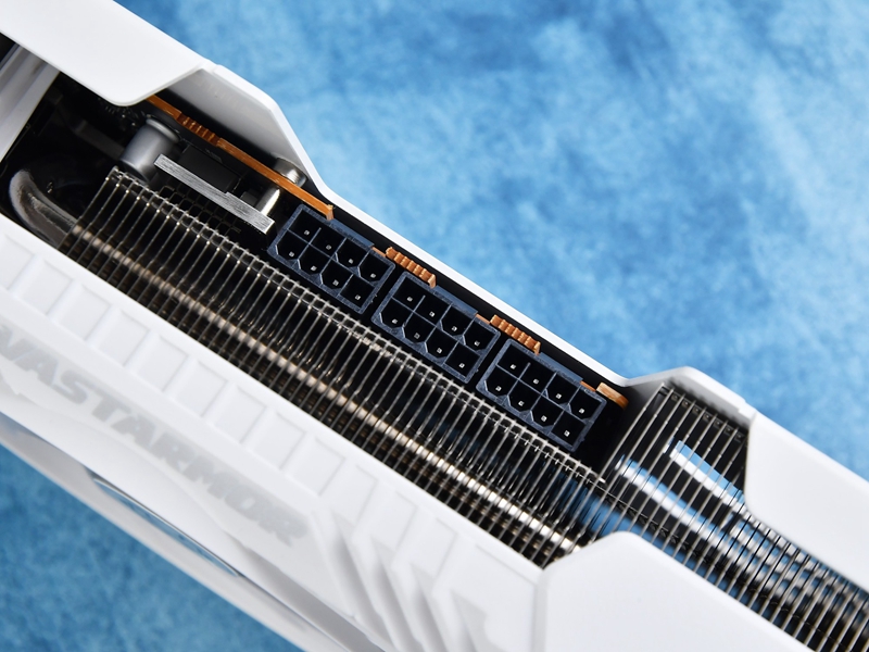 这款显卡采用了3×8PIN供电设计,同时供电口区域的背板做了梯形切割,方便用户插拔电源线。