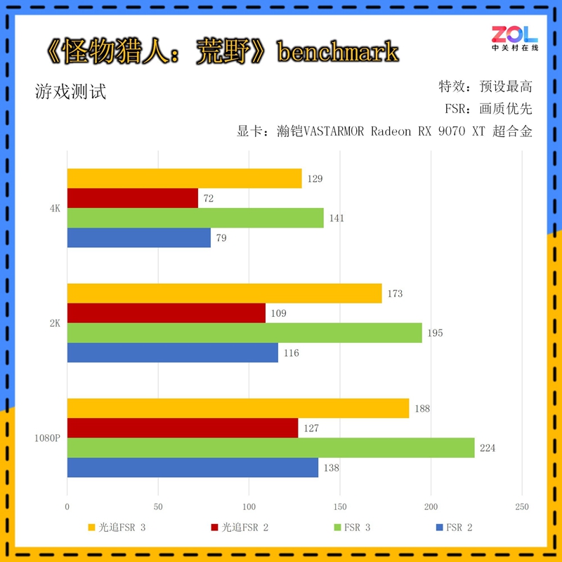 首先是常规游戏性能测试,这里我们选择了近期刚刚发售的《怪物猎人:荒野》,作为RE引擎制作的游戏,这一代对于硬件性能的要求还是比较高的。这里我们分别测试了不同FSR下游戏的帧数表现,可以看到除了4K+光追+FSR 2以及4K+FSR 2设定下,画面平均帧率分别为72fps和79fps之外,其它设置下帧率都超过了100fps,完全可以感受到狩猎的乐趣。
