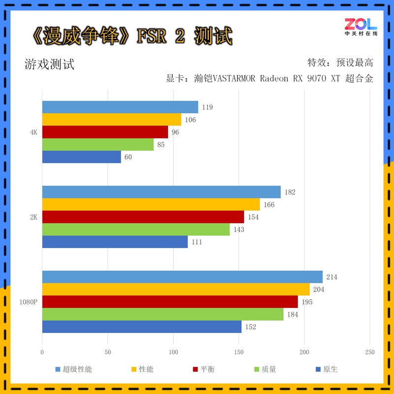 《漫威争锋》是近期火遍国内外的一款游戏,我们先来看看FSR 2下它的表现。可以看到同样是1080p和2K分辨率各档设定瀚铠VASTARMOR Radeon RX 9070 XT超合金显卡都能超过100fps流畅运行,而4K分辨率原生模式平均为60fps,极致性能模式平均为119fps,提升98%。