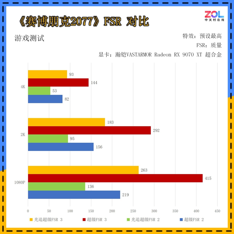 第三款常规游戏测试是《霍格沃兹之遗》,这里我们对比了不同FSR模式下,三档分辨率的帧率表现。瀚铠VASTARMOR Radeon RX 9070 XT超合金显卡除了4K原生画质平均帧率为89fps之外,其它设定下帧数同样都超过了100fps,可以非常流畅地运行这款游戏。