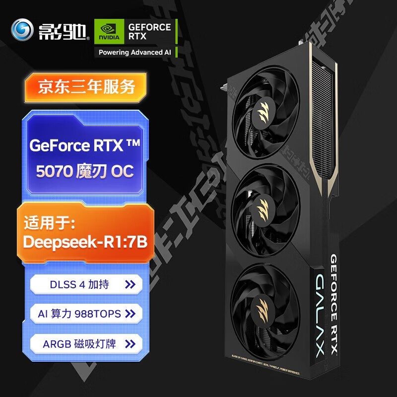 影驰 RTX5070 魔刃 OC 12GB GDDR7 DLSS 4 电竞游戏/设计剪辑/AI本地部署电脑显卡