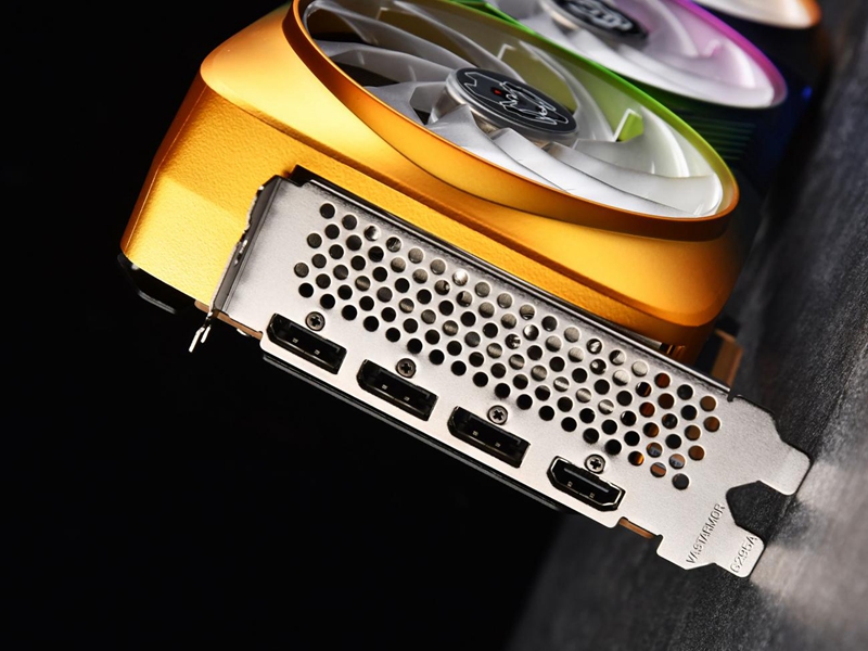 接口方面,这款显卡提供了1个HDMI接口和3个DP接口,帮助用户轻松搭建多屏显示空间。另外在卡体右侧面板上配有1个神光同步线缆接口。