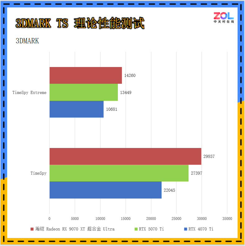 我们首先来看一下瀚铠 RX9070XT 超合金 Ultra显卡的基础理论性能表现,首先测试3DMARK,测试基于DX11环境的FS套装和基于DX12环境的TS测试。