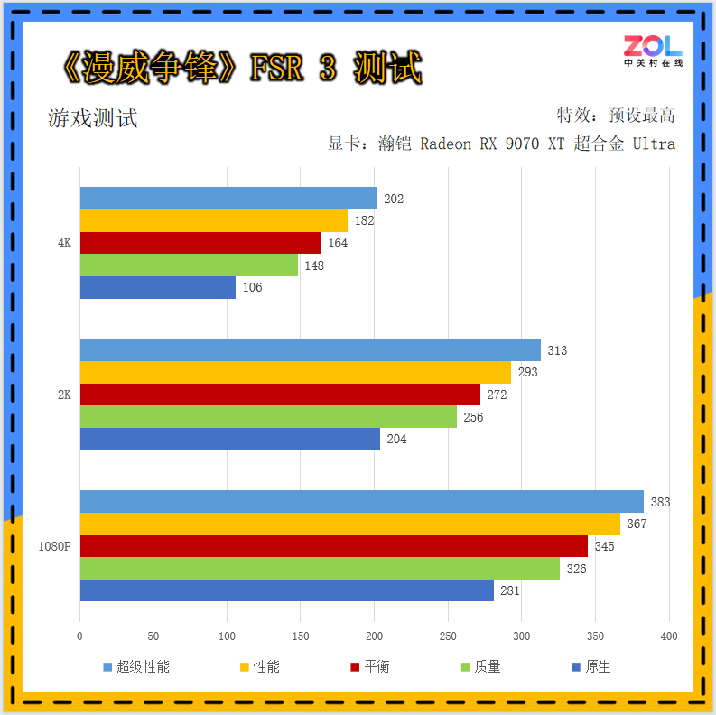 为了保证游戏的多样性,我们对《漫威争锋》也进行了测试,这是网易推出的一款MOBA类网游,同时也支持FSR 2和FSR 3。在测试中,4K分辨率平衡模式可达到近百帧的成绩,不过作为一款竞技游戏来说依然有些低。但当我们开启FSR 3后,就连4K分辨率原生画质的帧数都提升到了百帧以上,平衡档位达到164帧,已经可以应对大多数竞技网游对帧数的要求了。