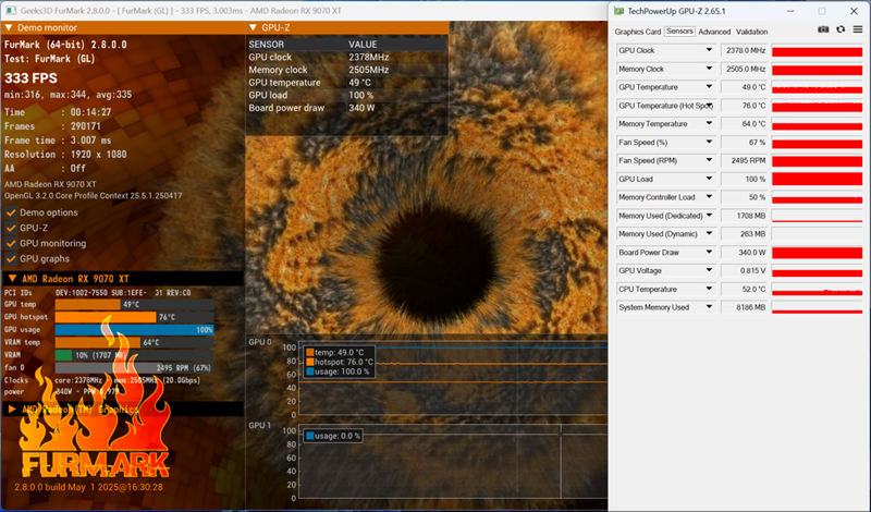 在经过了20分钟左右的Furmark拷机测试,这时瀚铠 RX9070XT 超合金 Ultra显卡的核心平均温度在49℃,显存平均温度为64℃,功耗达到340W左右。从温度数据不难看出,瀚铠在Radeon RX 9070 XT 超合金Ultra显卡的散热方面做的非常不错。尤其是最高热点温度也仅有76℃,三个大尺寸风扇以及散热模组对于降低核心温度起到了至关重要的作用。
