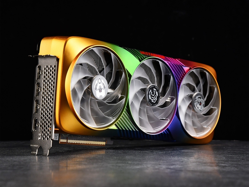 打开包装,果不其然,这块瀚铠 RX9070XT 超合金 Ultra显卡,并非常见的纯色设计,而是大胆的采用了亮眼的渐变色设计。显卡两侧边缘呈现出明亮的金色,中间部分则以绿色、紫色、红色等色彩构成渐变效果,营造出类似彩虹的效果,色彩过渡自然且富有层次感,透明风扇在转起后也会有相应的ARGB灯效,让其整体更具有视觉冲击力。