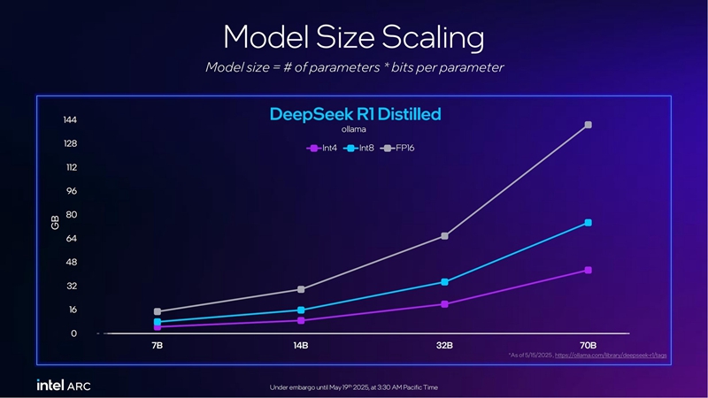 了解AI推理的朋友都知道,显存对于大语言模型生成速度的重要性不言而喻。不同参数规模以及不同数据类型的大语言模型对于显存的依赖虽然不同,但万变不离其宗的核心规律就是:显存越大速度越快。24GB显存的锐炫Pro B60无疑能够给有AI推理需求的企业用户带来更加高效的体验。同时,多卡协同还能实现70B超大规模参数大语言模型的运行。