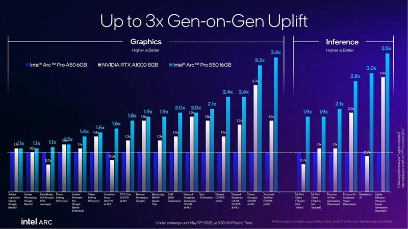 在更加细致的生产力相关图形性能方面以及推理性能方面,相比前代锐炫Pro A50以及NVIDIA RTX A1000来说,锐炫Pro B50代际提升幅度最高分别达到3.4倍和3.5倍。