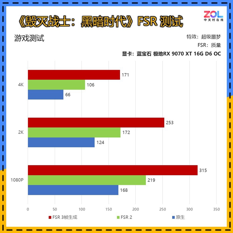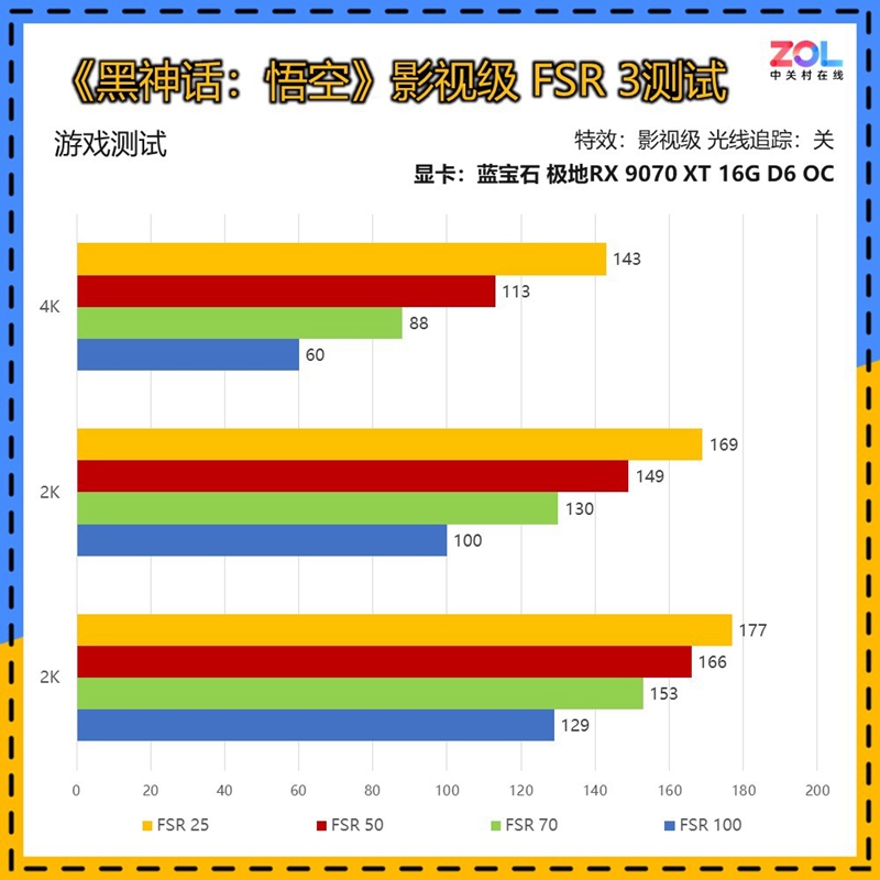 在开启FSR 3帧生成后,蓝宝石 极地RX 9070 XT 16G D6 OC在4K分辨率下也能达到170帧左右的超流畅水准。