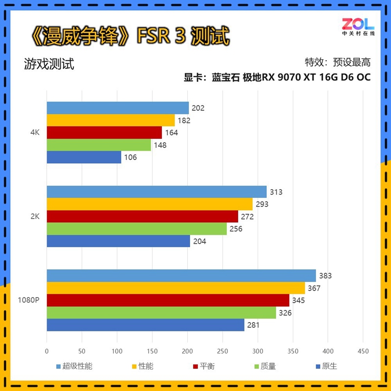 《漫威争锋》游戏自带FSR 3,开启后蓝宝石 极地RX 9070 XT 16G D6 OC在4K分辨率原生画质下已经达到106帧,而FSR质量挡位的148帧,已经达到电竞游戏“跟手”的体验标准了。