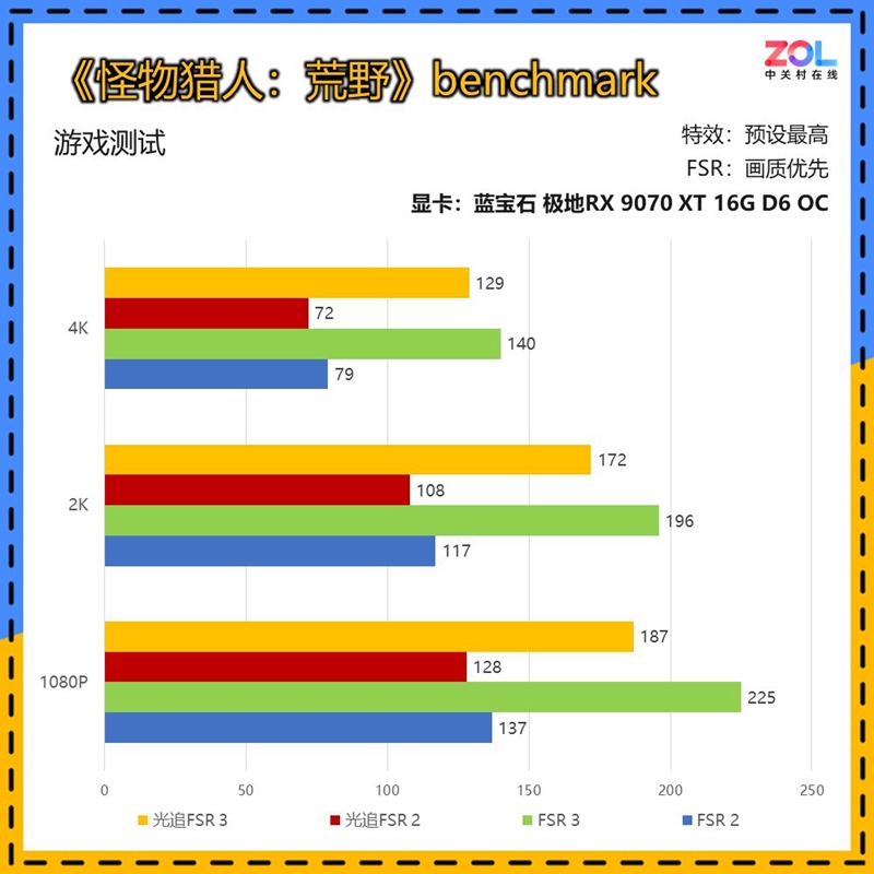蓝宝石 极地RX 9070 XT 16G D6 OC在《怪物猎人:荒野》的表现比较令人惊叹,可以看到在4K分辨率下,开启FSR 3后,即便打开光线追踪也能达到129帧,相比无光追的帧数仅差10帧左右,性能还是非常强悍的。