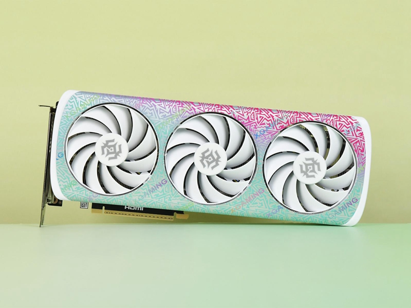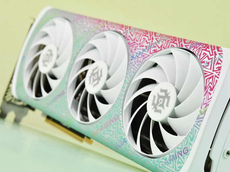 拆开包装拿出本体,与包装截然相反的是一块充满涂鸦线条并以白色为主色调的显卡,颜值颇高。索泰 RTX5060Ti 8G XGAMING OC显卡以Mr.Doodle涂鸦艺术为灵感,银色基底上覆盖数百条红、紫、蓝、绿渐变线条,通过特殊印刷工艺呈现动态光影效果。并且在顶部集成ARGB幻彩信仰灯模块,支持1600万色灯效。