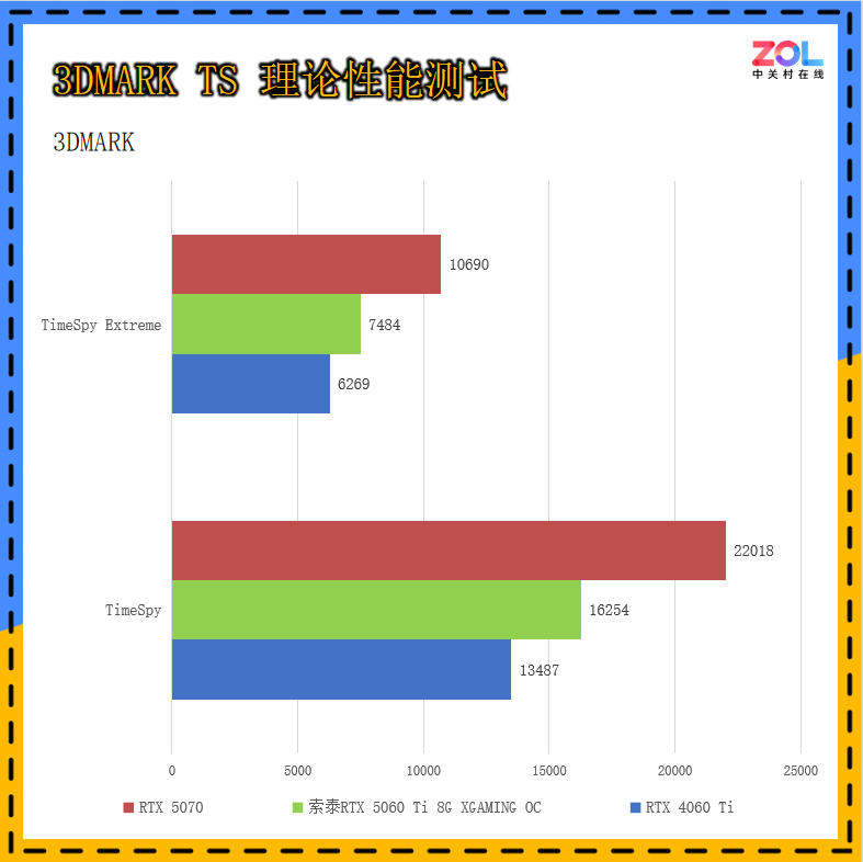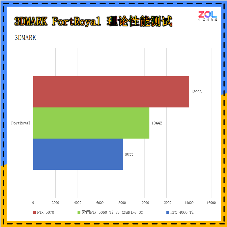 再来看一下索泰 RTX5060Ti 8G XGAMING OC显卡在光追中的性能表现,3DMARK中有针对光追的PortRoyal测试项目。