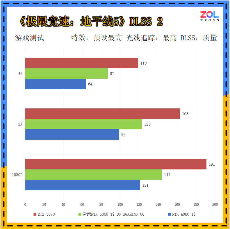 《极限竞速:地平线5》的优化极为出色,让不少硬件在原生画质下也能跑出优秀的成绩,所以也是我们显卡测试中的常驻嘉宾。实测在开启DLSS2下,索泰 RTX5060Ti 8G XGAMING OC显卡相较于RTX 4060 Ti 8GB显卡,帧数提升幅度大致处于25%-30%这一区间。4K分辨率下帧数也是达到了90帧左右,对于一款赛车游戏来说,这个帧数绰绰有余了。