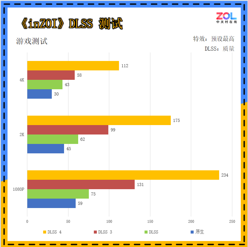 在《inZOI》的DLSS 4测试时我们可以看到,在开启DLSS 4后,帧数基本要领先其他模式,在1080P模式下更是轻松提升百帧,这一帧数趋势与上面的《赛博朋克2077》基本一致。由于目前只有50系显卡支持开启DLSS 4,所以对比同档位的40系显卡,索泰 RTX5060Ti 8G XGAMING OC会明显拥有更高的平台性能上限。