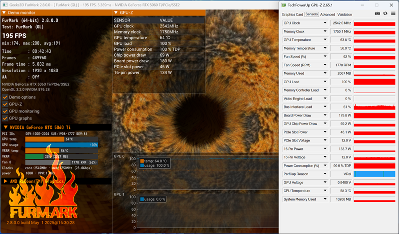 在经过了20分钟左右的Furmark拷机测试,这时索泰 RTX5060Ti 8G XGAMING OC显卡的核心平均温度在63.8℃,显存平均温度为58℃,功耗达到180W左右。在散热方面三风扇相较于其他双风扇的5060 Ti优势就相当明显了,大概要比双风扇的平均温度低了5℃左右。