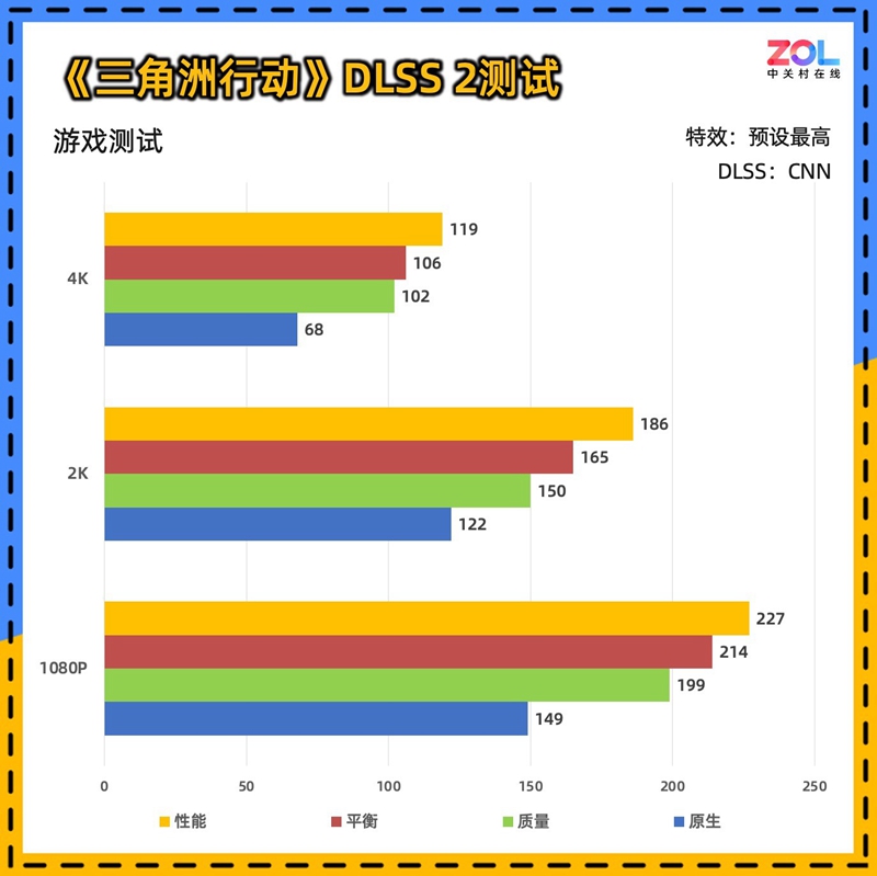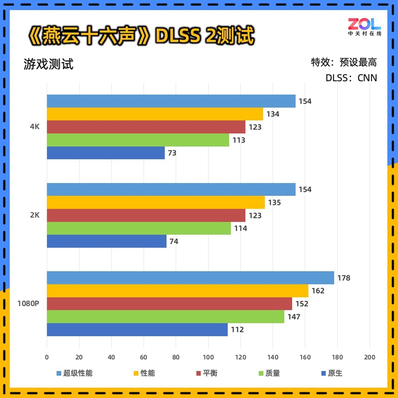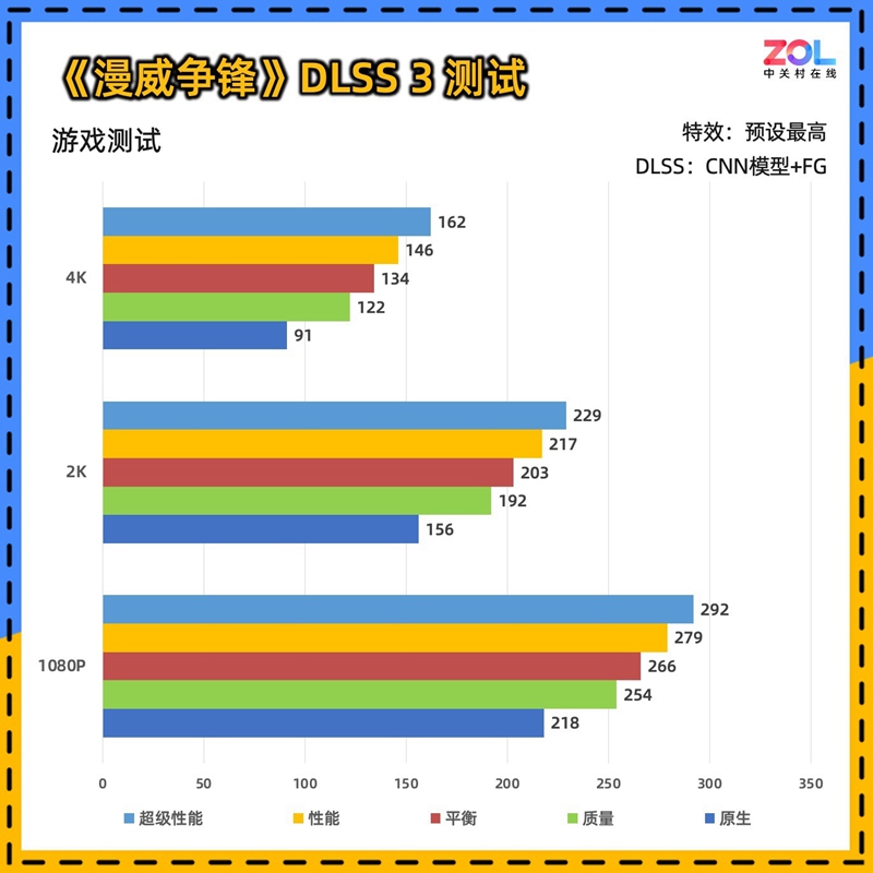 加入DLSS 3帧生成的测试后,帧数进一步拉开,2K分辨率下质量模式达到了199帧,对于一款FPS电竞游戏来说,会带来更“跟手”的体验。