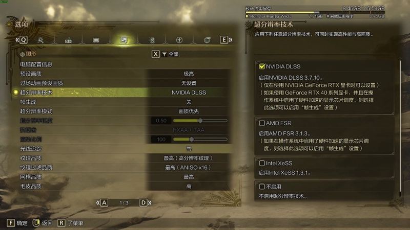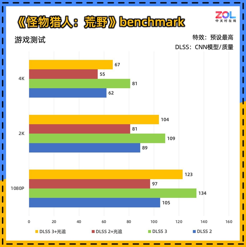 第二个游戏是刚刚发布的《怪物猎人:荒野》,游戏增加了光线追踪,但运用到的效果不多,主要为水面反射,所以对帧数影响并不大,有需要的玩家可以开到最低挡。根据官方提示,使用高清材质包需显存在16GB以上,因此本次测试无高清材质包。测试时将开启光线追踪品质。