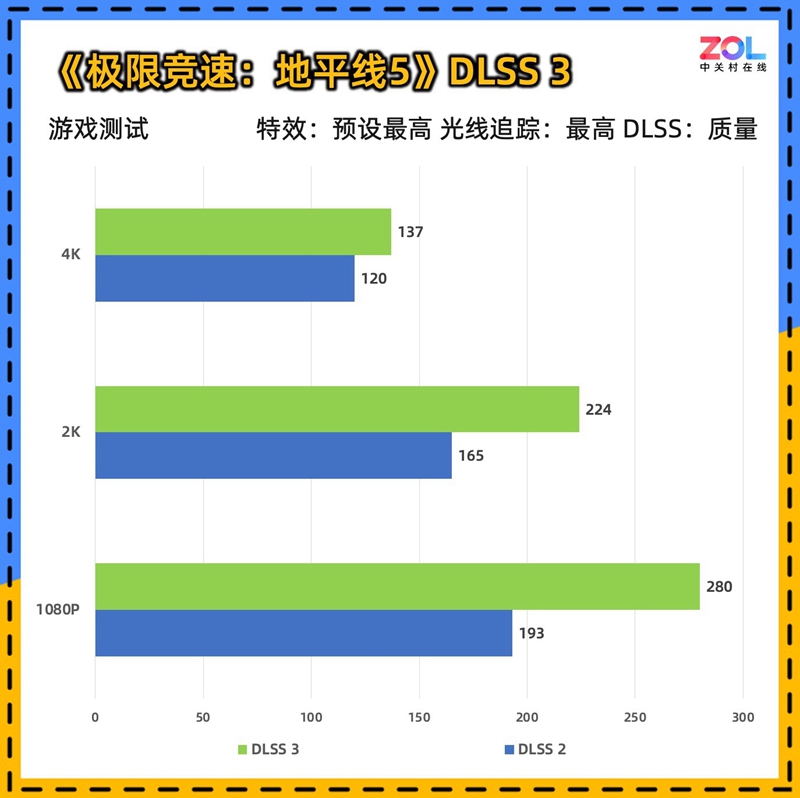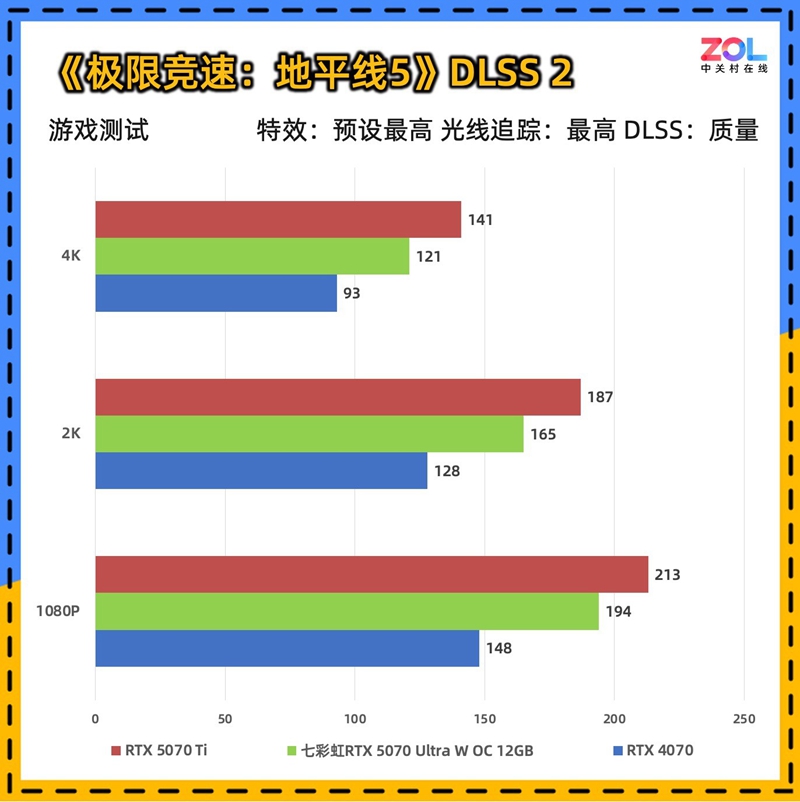 第三个游戏是显卡测试的常客《极限竞速:地平线5》,其出色的优化在原生效果下即可跑出优秀的成绩。在2K分辨率下,七彩虹iGame RTX 5070 Ultra W OC 12GB的DLSS 2成绩达到了224帧,4K分辨率也达到了137帧,对于赛车游戏来说非常流畅。