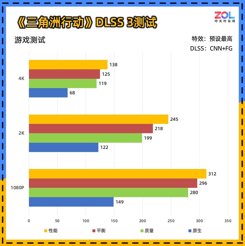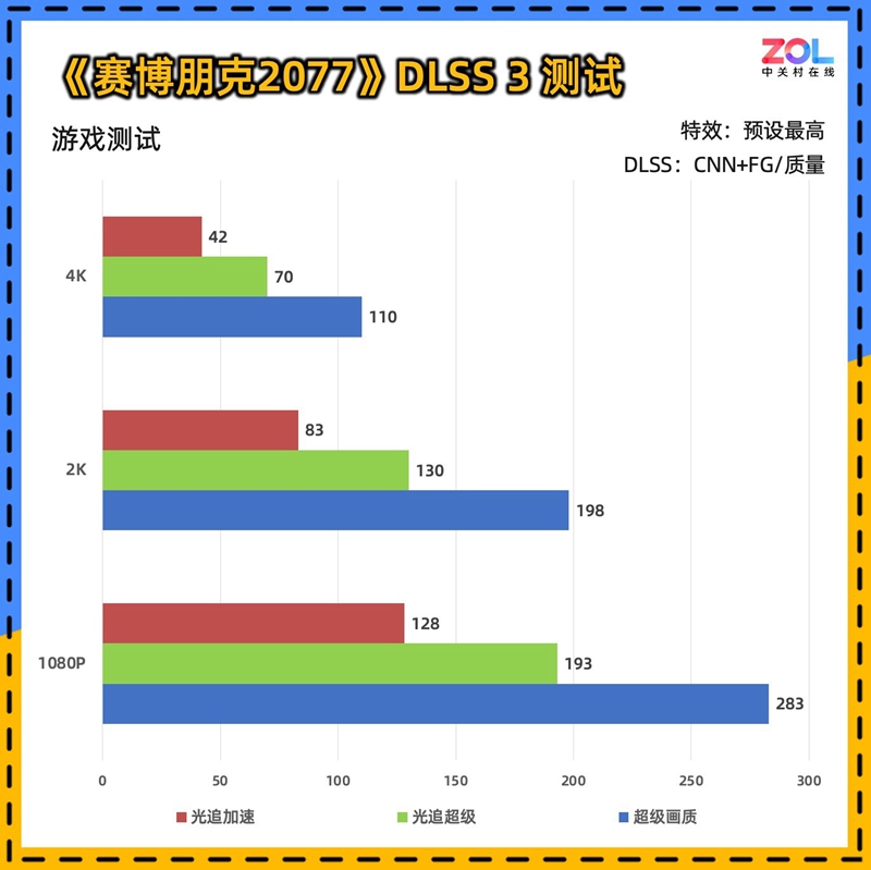 而在DLSS 3的测试成绩看起来比较正常。在2K分辨率大部分DLSS成绩均在200帧以上,玩家可以大胆的安排2K240Hz的显示器了。
