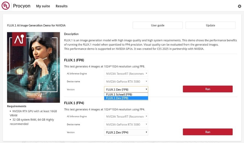 UL Procyon提供了FLUX.1Dev绘画模型的FP4测试,该模型在FP16上运行需要超过23GB的显存,而FP8也需要超过16GB的显存,但FP4只需要不到一半的显存。而且FP4使用NVIDIA Tensor RT提供的量化方法,几乎没有质量损失。更小的显存消耗让更多80级和70级的显卡均能在本地运行。
