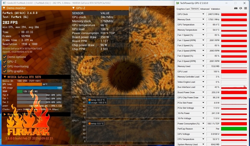 功耗和温度测试,我们选择FurMark2搭配GPU-Z来进行,信息记录以GPU-Z为准。经过30分钟左右的烤机,七彩虹iGame RTX 5070 Ultra W OC 12GB的GPU和显存的温度为66.4℃和58℃,散热控制非常不错。在TDP100%满载情况下,整卡功耗仅为250.2W,对于电源的功率要求非常友好。