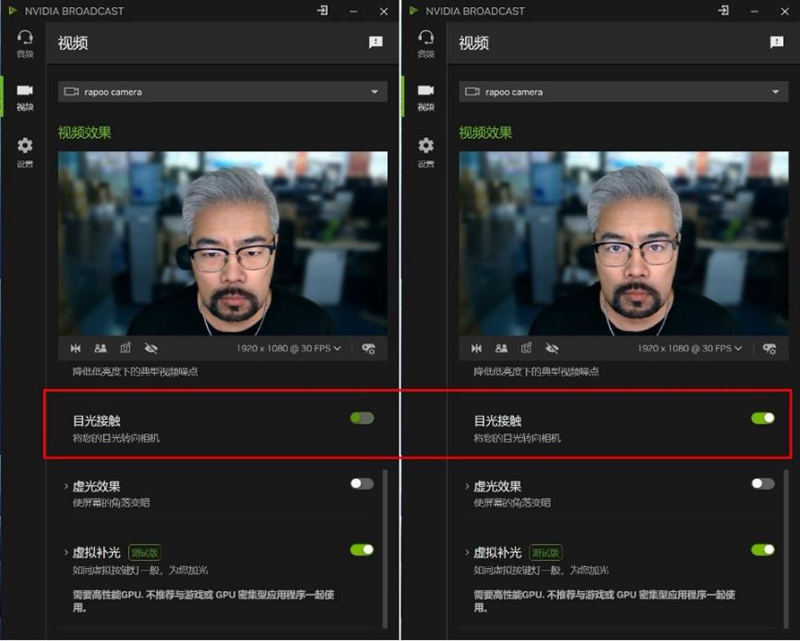 NVIDIA Broadcast一些经典效果更方便开启,其中目光接触功能非常适合远程会议,即便眼睛盯着屏幕,也能让参与人员时刻注意到你的眼睛,并且还有一定“大眼”效果。