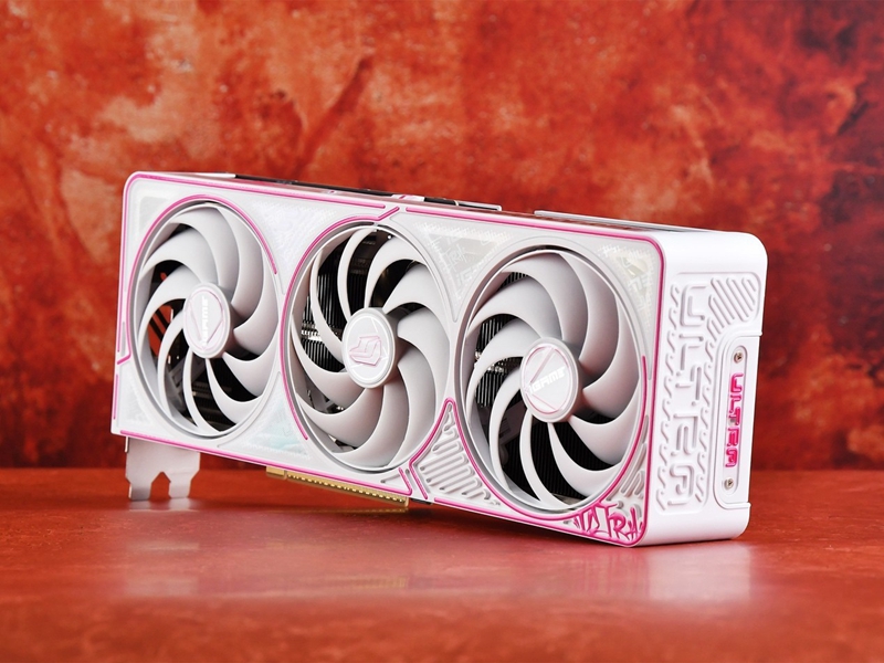 背部配备高强度嘻哈背板,为显卡提供额外防护和支撑的同时,还兼具散热效果。背板采用纯白底+经过特别设计的桃粉“ULTRA”涂鸦字体,彰显嘻哈元素。侧面的大面积镂空更利于风道流通,便于显卡内部热空气快速排出。