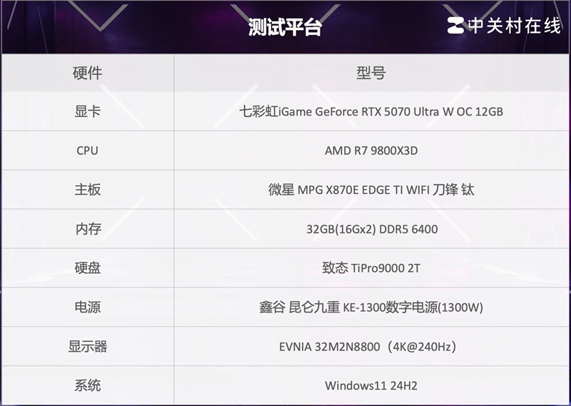为了保障七彩虹iGame RTX 5070 Ultra W OC 12GB显卡的性能发挥,我们的平台也进行了全面更新,包括AMD R7 9800X3D处理器、32GB DDR5 6400MHz内存以及PCIe5.0固态硬盘,以及4K240Hz游戏显示器,操作系统版本为Windows 24H2。