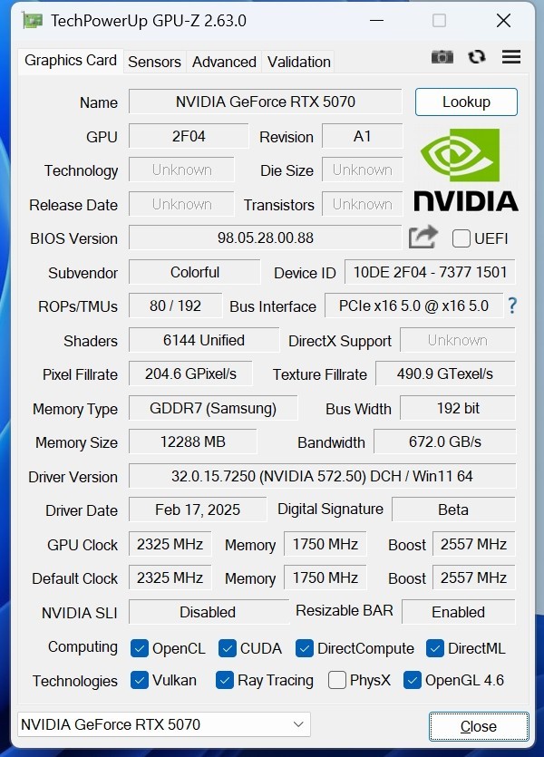 GPU-Z的更新速度再次落后,最新版本2.63也未能读取全部的信息。七彩虹iGame RTX 5070 Ultra W OC 12GB显卡采用GB205核心,TSMC4nm定制工艺,支持PCIe 5.0x16接口规范,拥有6144个CUDA核心,Boost频率达到了2557MHz,比公版规格高出不少。搭配12GB的三星GDDR7颗粒,位宽为192bit,带宽672GB/s。
