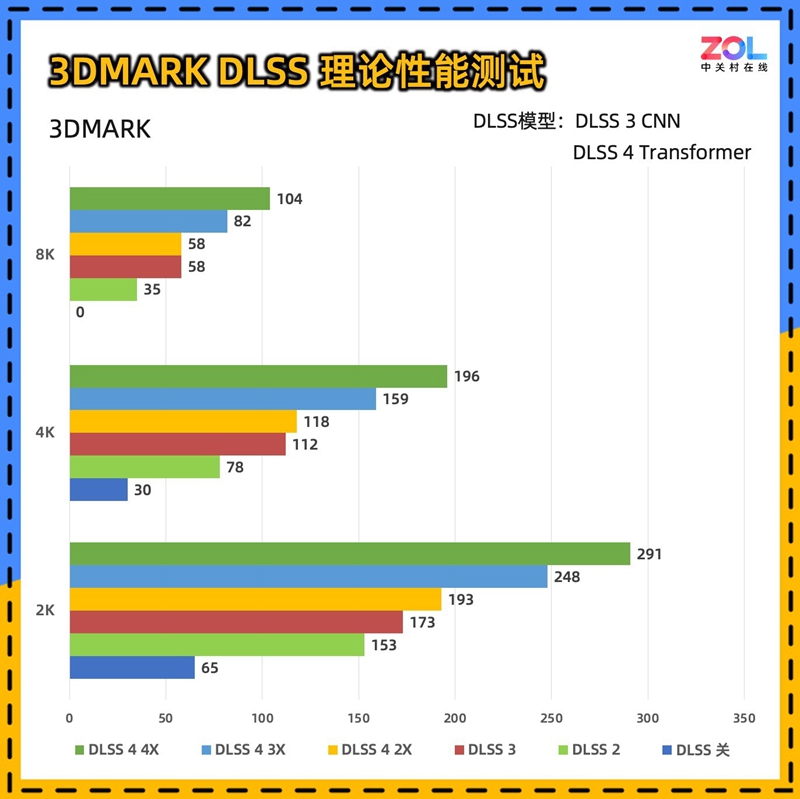 DLSS的理论测试变化较大,DLSS 2和DLSS 3采用上一代的CNN模型,而最新的多帧生成则采用了Transformer模型,并且多帧生成可调节生成帧的数量。从测试结果看,DLSS 4 2X基本可以看作是DLSS3的帧生成,而DLSS 4 4X模式相比DLSS 3,帧数综合提升在74%左右,其中8K分辨率提升高达79%左右,凭借DLSS4的多帧生成达到104帧,关闭DLSS则是完全无法运行的0帧状态。