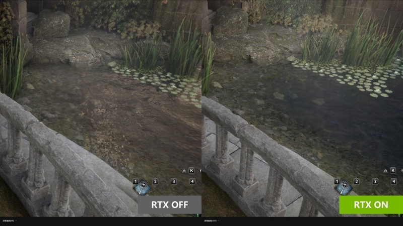 画面方面,虽然打开光追后对于配置要求大幅提升,但画面的提升也是立竿见影的,在下面的对比截图中,池塘中的水体能明显看到随着深度的不同,水体颜色也呈现渐变的透明,达到以假乱真的效果。