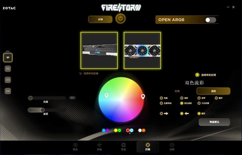 风扇转速页面可以看到风扇的转速,根据不同的配置文件还可以自定义性能优先或静音优先,满足不同的使用场景需求。在光效页面,索泰FireStorm可以控制LOGO和启世之环的灯效,提供了1600万色灯效,实现多种动态灯光。