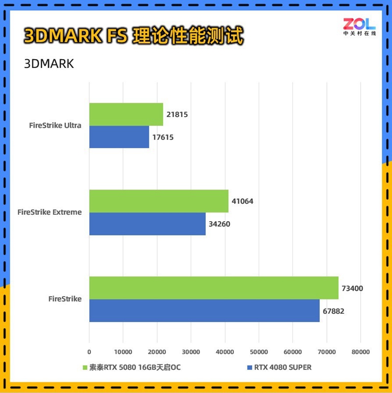 在针对显卡DX11性能的3DMARKFS套装测试中,索泰RTX 5080 16GB天启OC的提升对比RTX4080 SUPER,在三档分辨率中的提升分别为,8%/19%/23%,综合提升约为16%。
