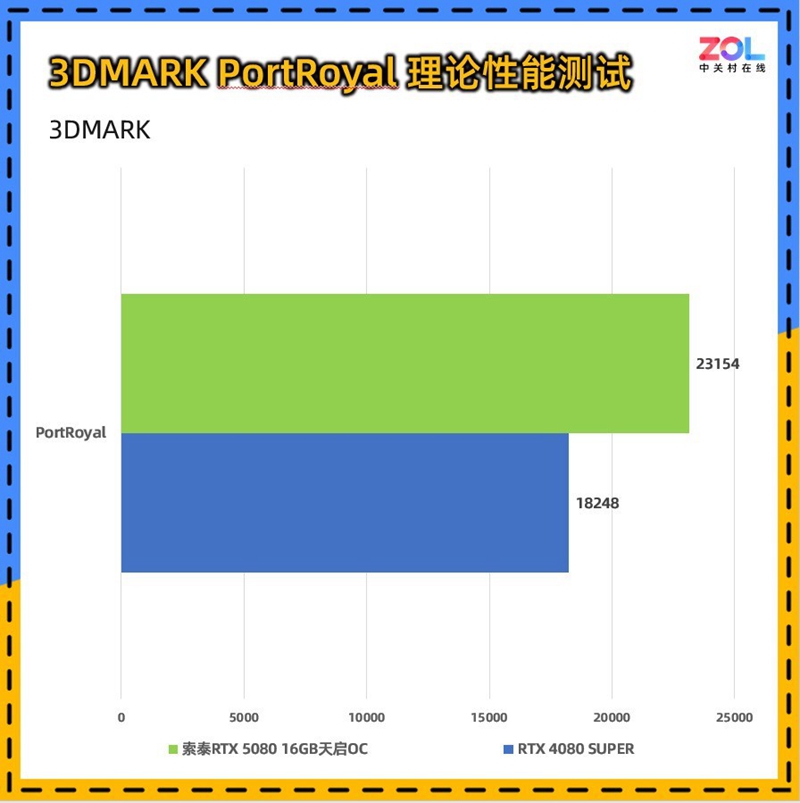 PortRoyal是3DMARK中专门针对光追性能的测试项,索泰RTX 5080 16GB天启OC相较RTX4080SUPER的提升约为27%。综合来看,索泰RTX 508016GB天启OC的理论性能相较RTX4080 SUPER的提升约为22%。