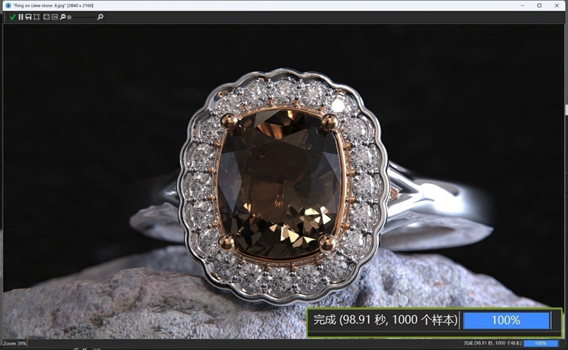 使用索泰RTX 5080 16GB天启OC渲染一张4K分辨率,采样率为1000的图片,最终用时99秒左右。