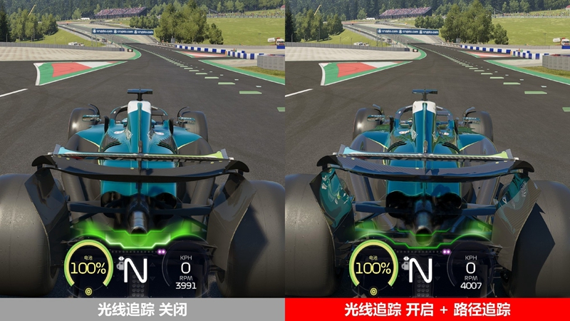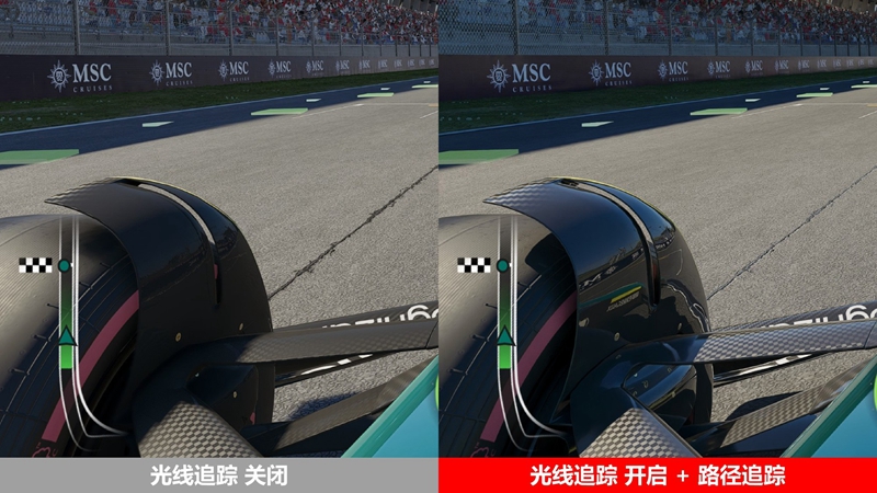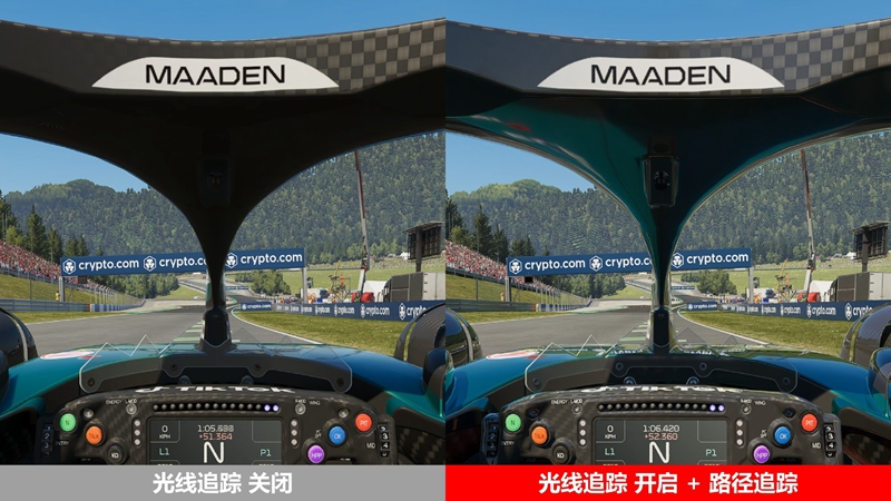 下面来看看《F1 25》在光线追踪关闭与全开下的画面表现差异。游戏中画质调节是实时的,且在车库中即可看出差异。