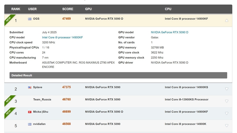 在3DMark Port Royal测试成绩中,OGS将影驰 RTX5090 D HOF OC LABXOC限量版的显卡核心频率突破至3622MHz,显存频率2250MHz,并取得了47469的高分,在3DMark Port Royal排行榜中位列榜首!