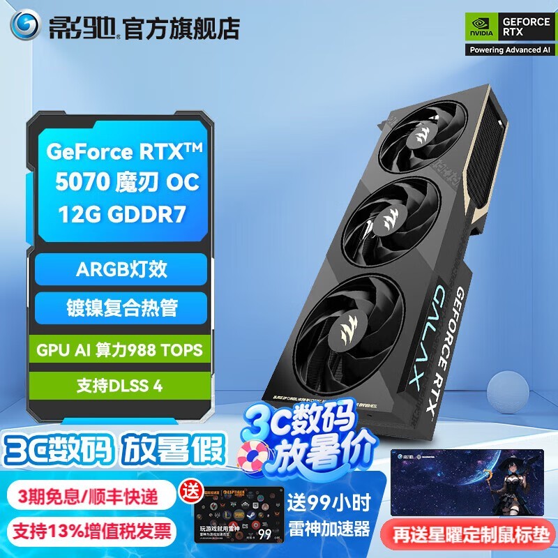 影驰 RTX5070魔刃OC显卡,性能强劲,专为高端游戏与深度计算打造,搭载先进架构与高速显存,带来流畅高画质体验,全新散热设计有效提升稳定性与静音效果,满足长时间高强度使用需求,京东现售5999元,参与满1999减500及每满1999减200优惠活动,叠加后实付仅需4899元,限时特惠,值得入手。