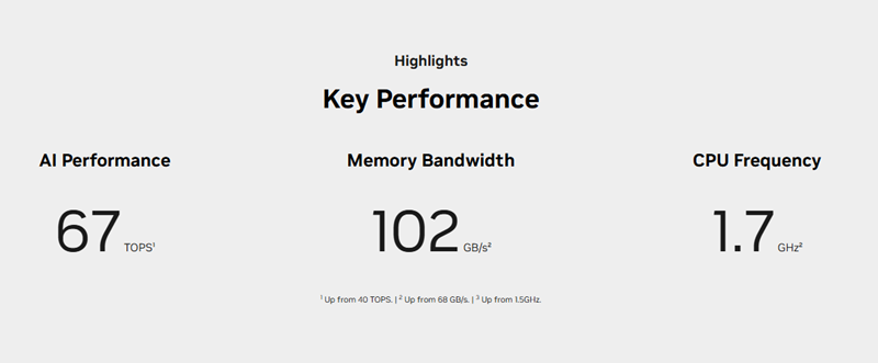 从目前发布的参数来看,该开发者套件现已上市,与上一代相比,其生成式AI推理性能提升至1.7倍,性能提升了70%,达到67INT8 TOPS,内存带宽提高了50%,达到102GB/s,而尺寸仅为45x 69.6毫米,堪称当前最具性价比的AI模组。