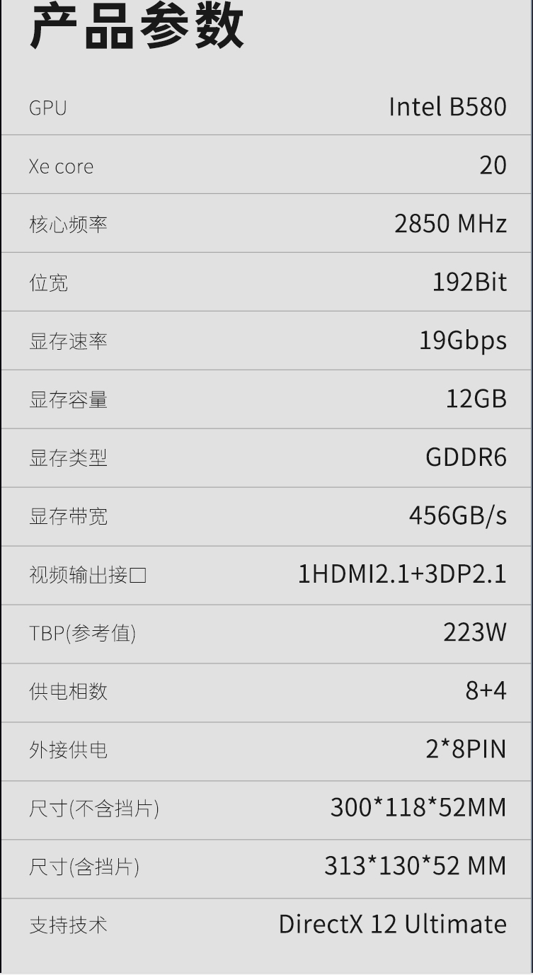 这里,小编就以蓝戟 Arc B580 PHOTON 12GB显卡为例,为大家介绍一下蓝戟intel全新B580显卡的参数与表现。
