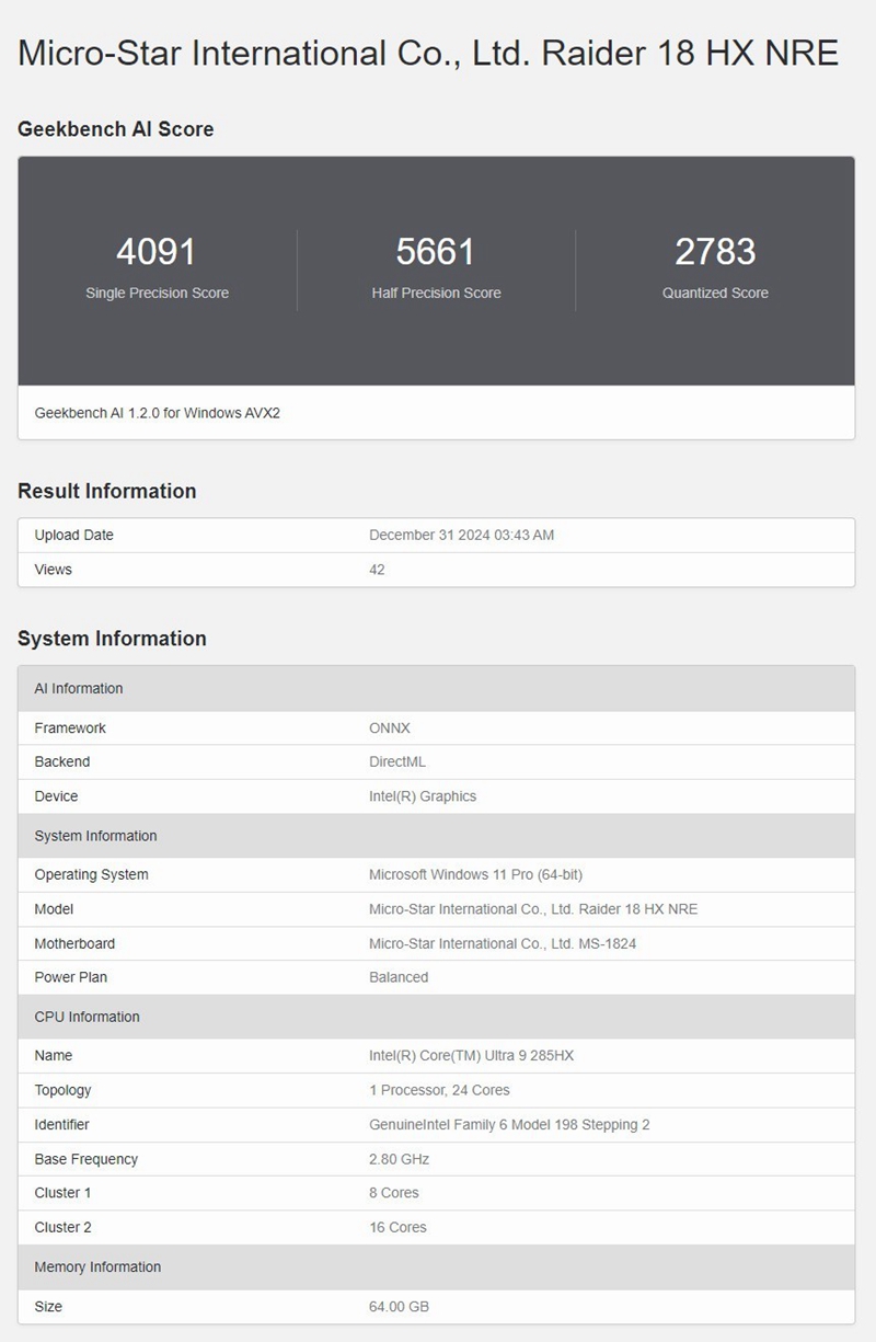 此外,酷睿Ultra 9 285HX预计配备36MB的L3缓存,并集成基于Xe架构的显卡,GPU核心频率为2.0GHz。在Geekbench的单精度AI测试中,它获得了4091分,展现了出色的AI性能。